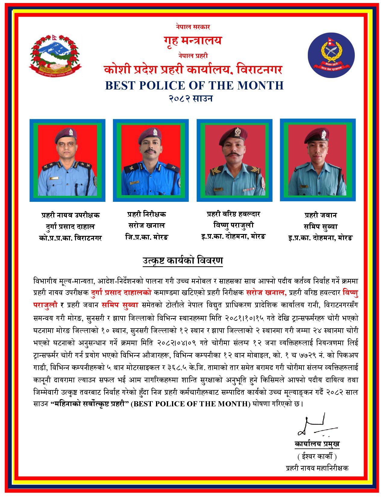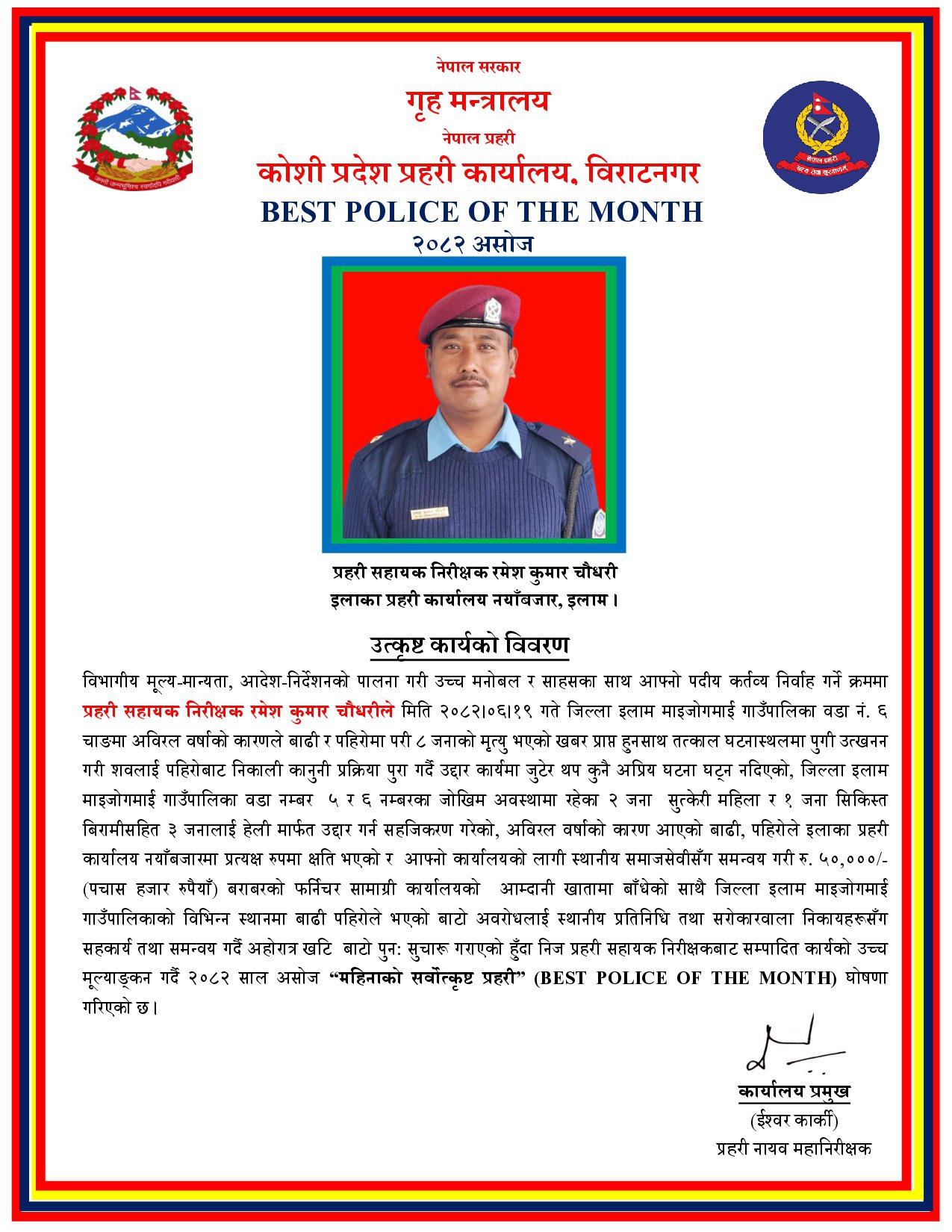 कोशी प्रदेशको साउन महिनाको सर्वोत्कृष्ट प्रहरी