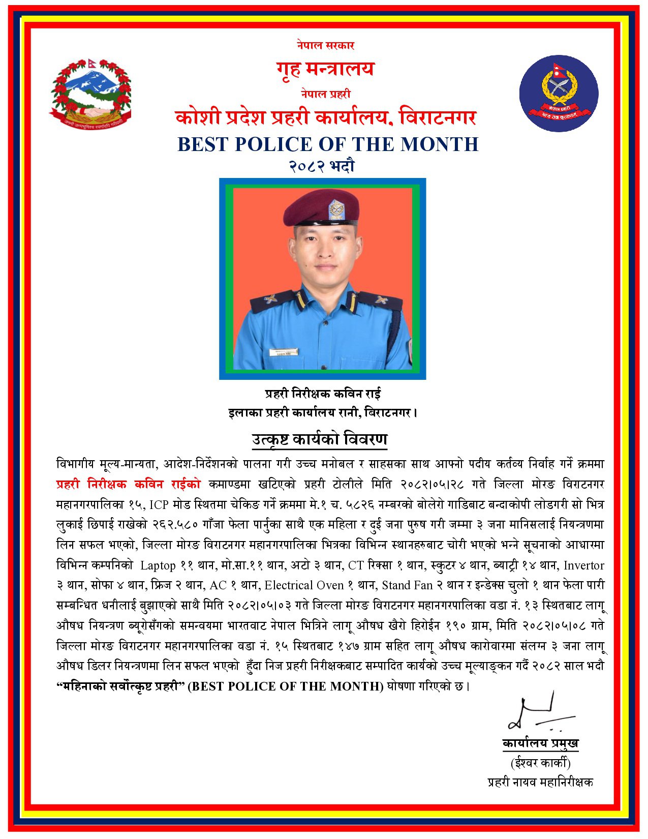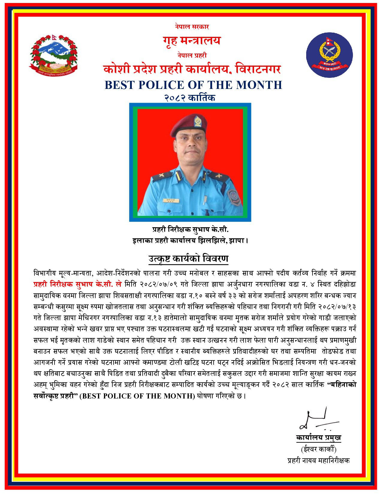 कोशी प्रदेशको कार्तिक महिनाको सर्वोत्कृष्ट प्रहरी